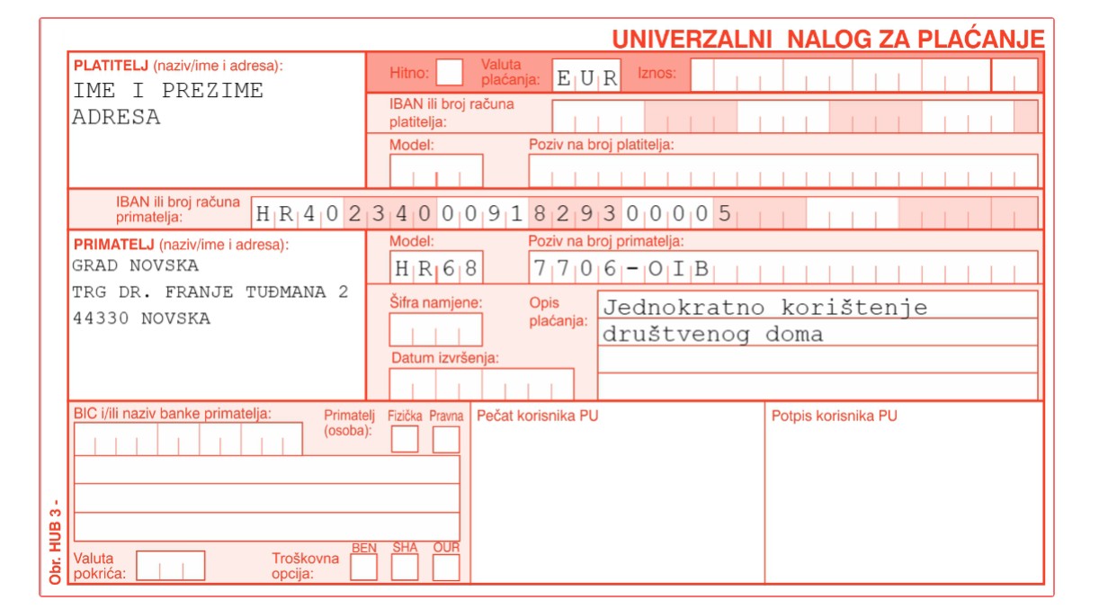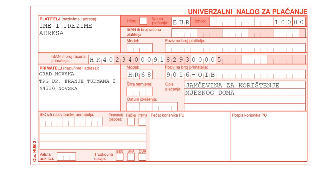 Nadalje, pripremamo obrazac Zahtjeva za privremeno korištenje mjesnog doma (može se preuzeti na našoj web stranici) te pripremamo ugovore o privremenom korištenju i uplatnice za plaćanje naknade i jamčevine za korištenje mjesnog doma (osim za slučajeve kad je korištenje doma besplatno poput održavanja krstitki i karmina, a što je definirano člancima 8. i 9. Odluke o privremenom korištenju poslovnog prostora za javne i druge namjene u mjesnim domovima). Primjeri uplatnica sa potrebnim podacima za plaćanje naknade i jamčevine mogu se pronaći na našoj web stranici.  Na licu mjesta vršimo primopredaju mjesnog doma na korištenje kao i povrat doma nakon korištenja, uz sačinjavanje zapisnika (prilikom predaje na korištenje i nakon korištenja)